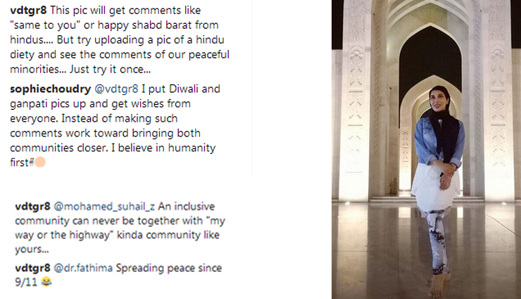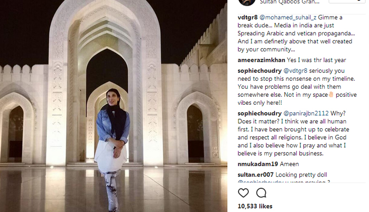 Recently, Sophie Choudry visited a mosque in Muscat, she uploaded a picture from there with a wonderful message. But, some people don't have sense what they say. The guy tried to slam her, but she has the perfect ans to shut him up.